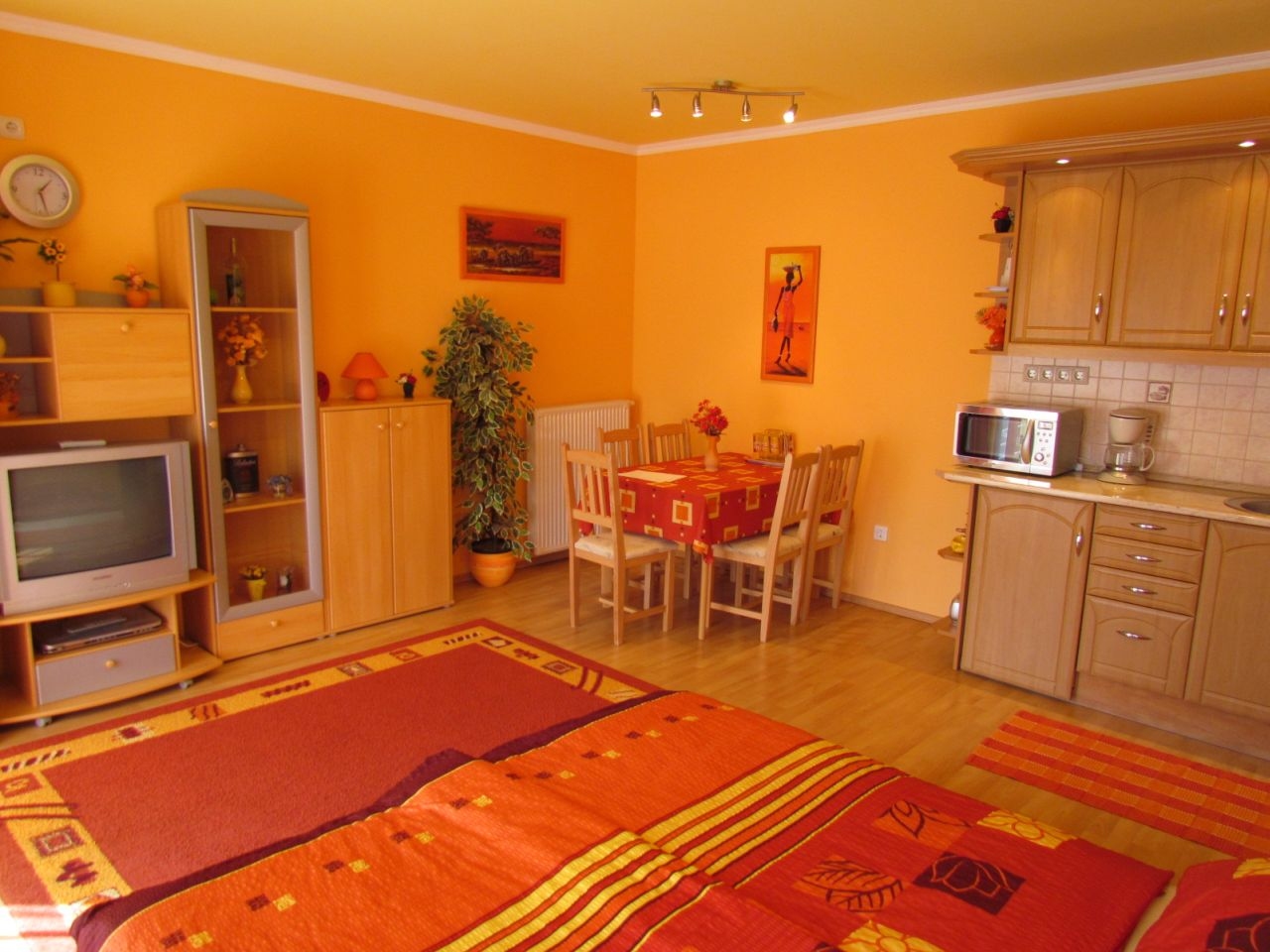 Jól felszerelt amerikai konyhás nappali étkezővel (elektromos tűzhely, hűtőszekrény, mikró, kávéfőző, kenyérpirító és konyhai kiegészítők stb.), kihúzható ággyal, kábel TV, DVD-vel.